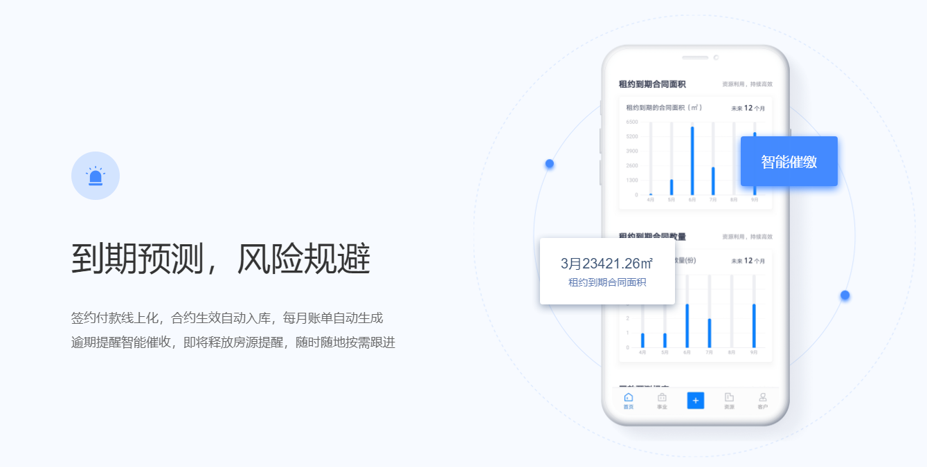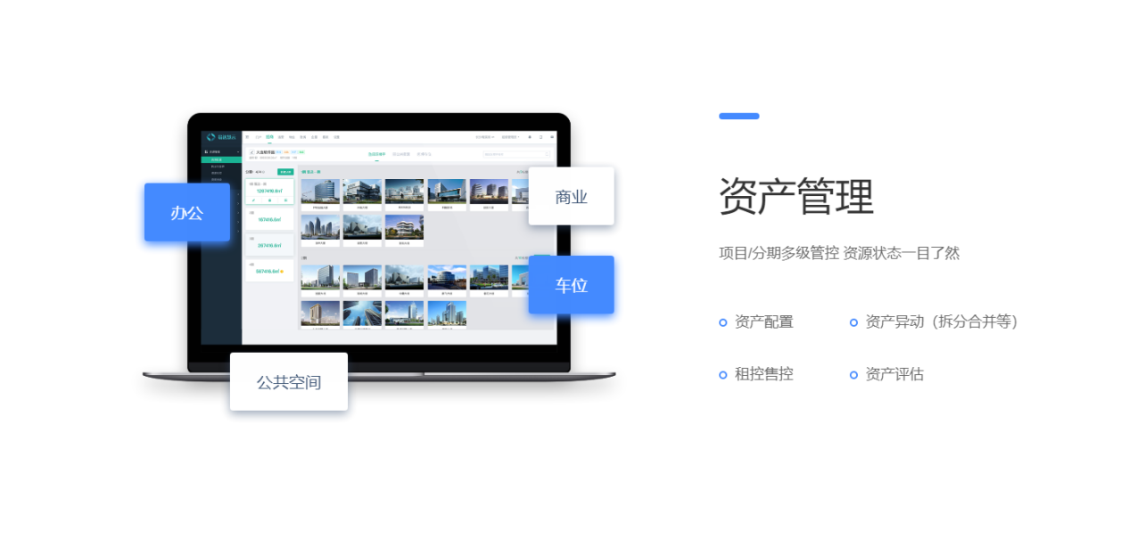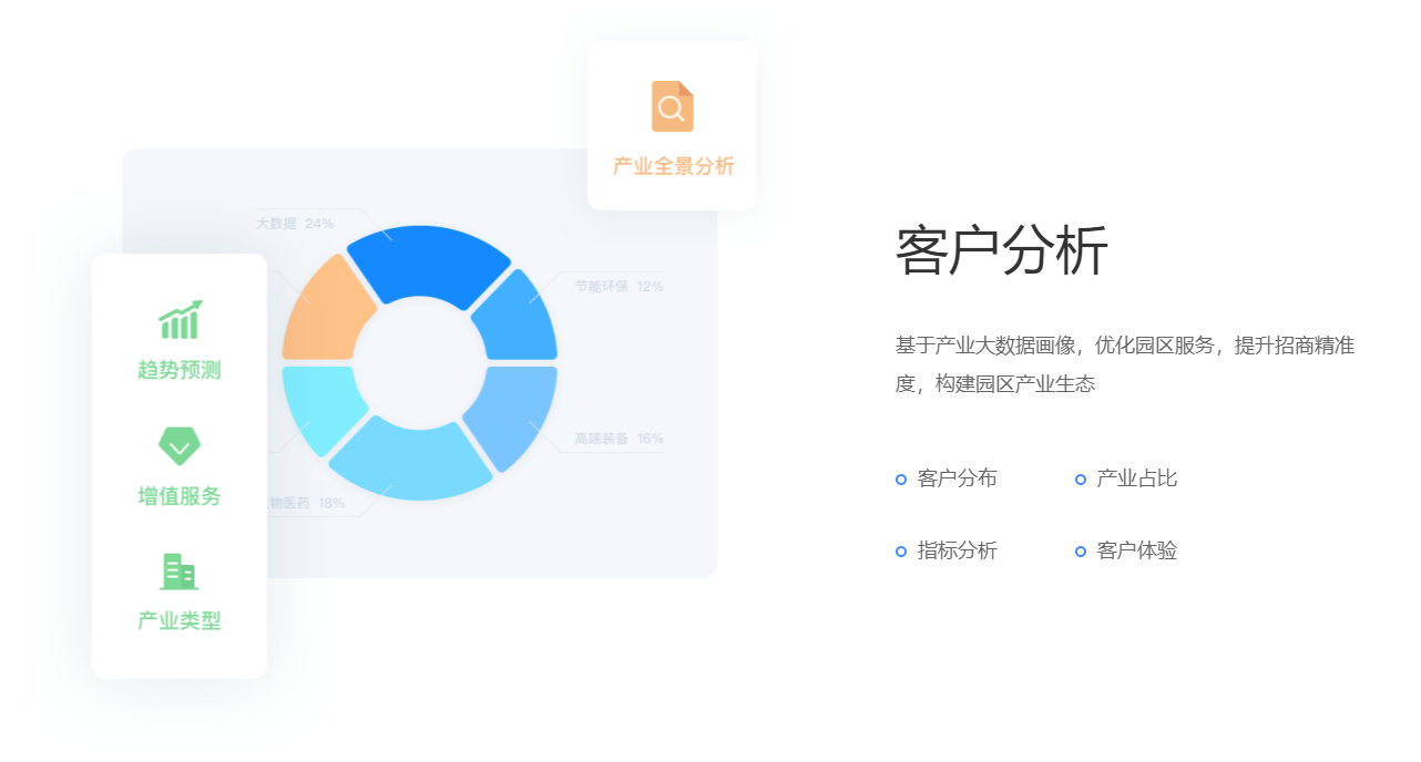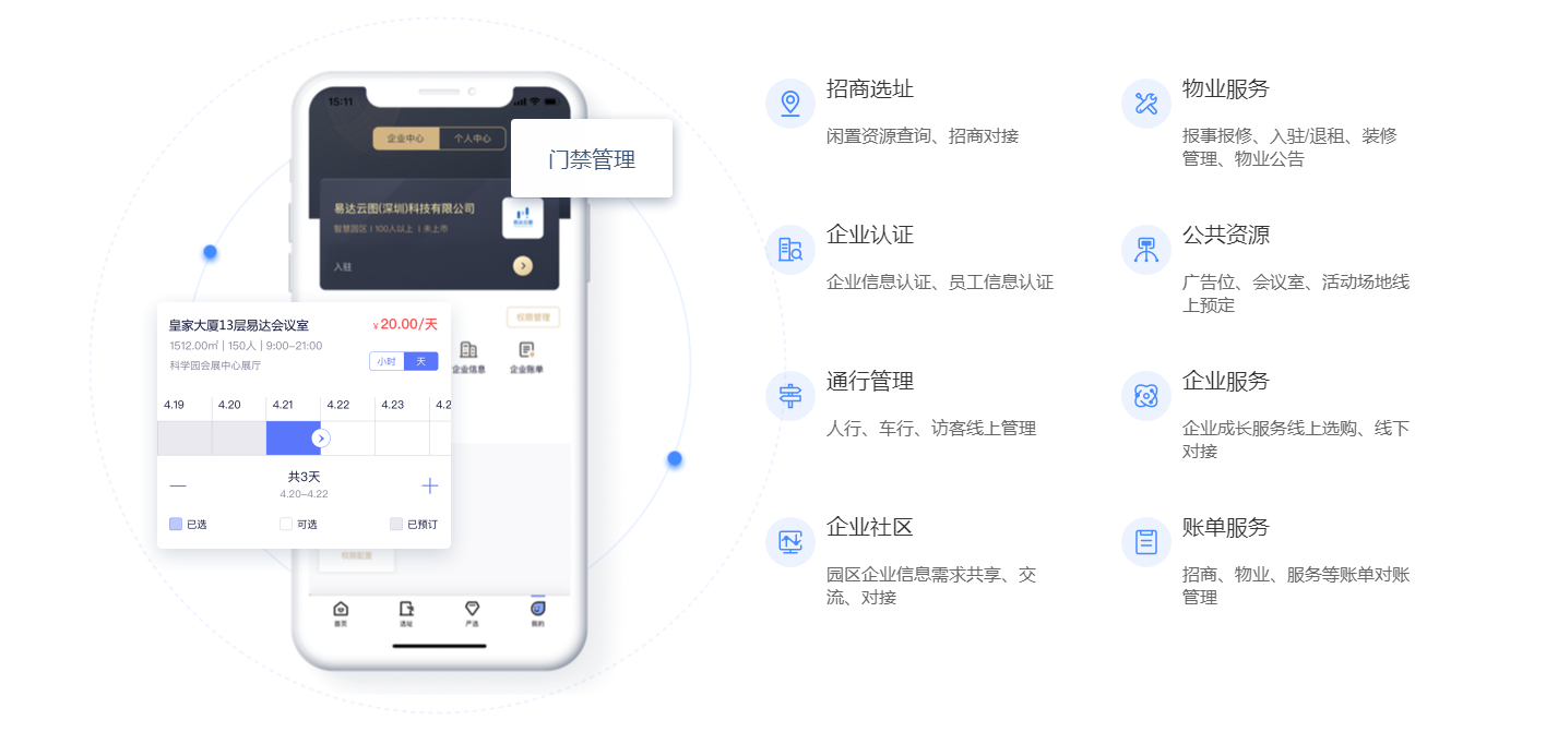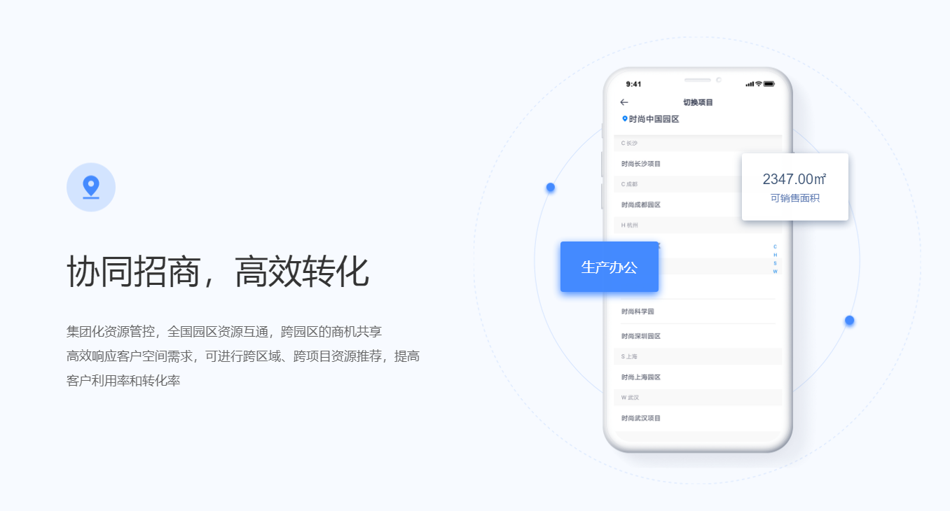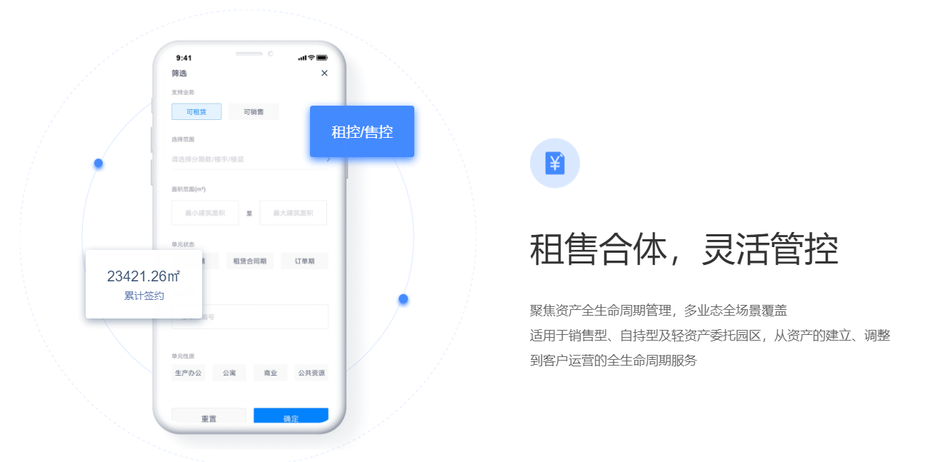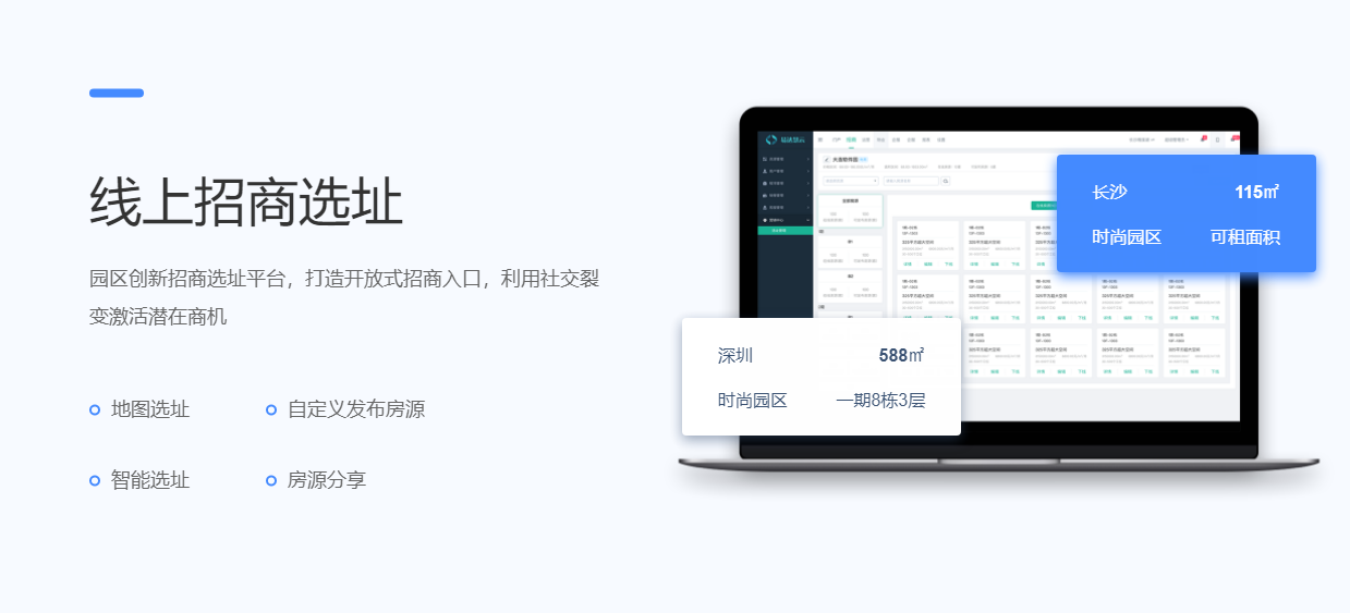 围绕产业客户招、租、管、退四个阶段,实现产业空间招商、租赁的核心业务管理闭环。基于大数据分析与物联网技术,帮助园区构建集楼宇资源管理、客户管理、合约管理、财务管理为一体的园区管控体系,有效解决园区运营痛点,提升园区运营管理效率与园区综合竞争力。