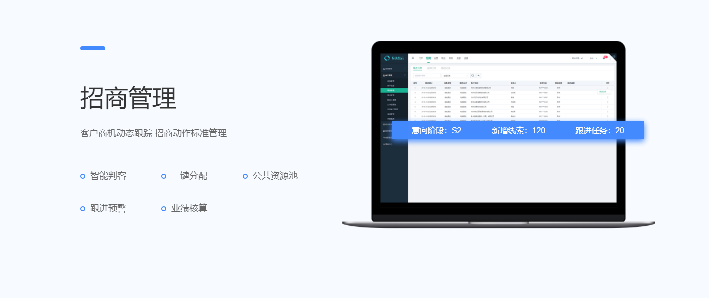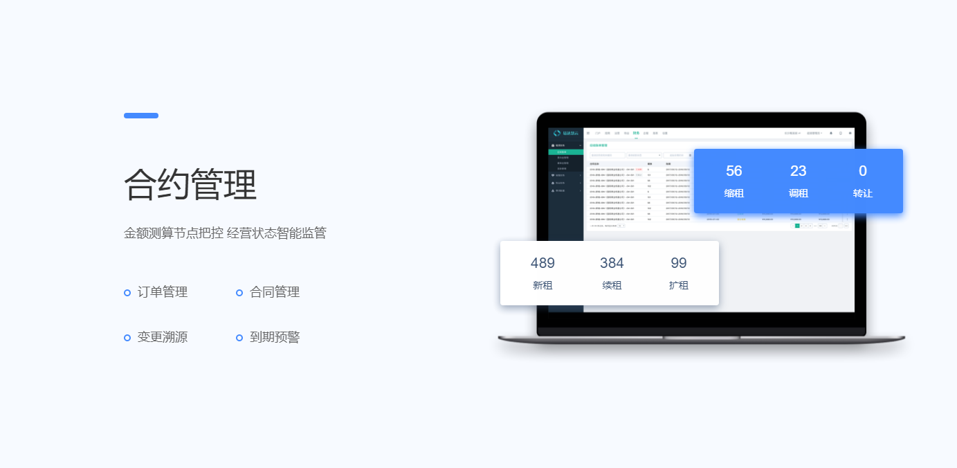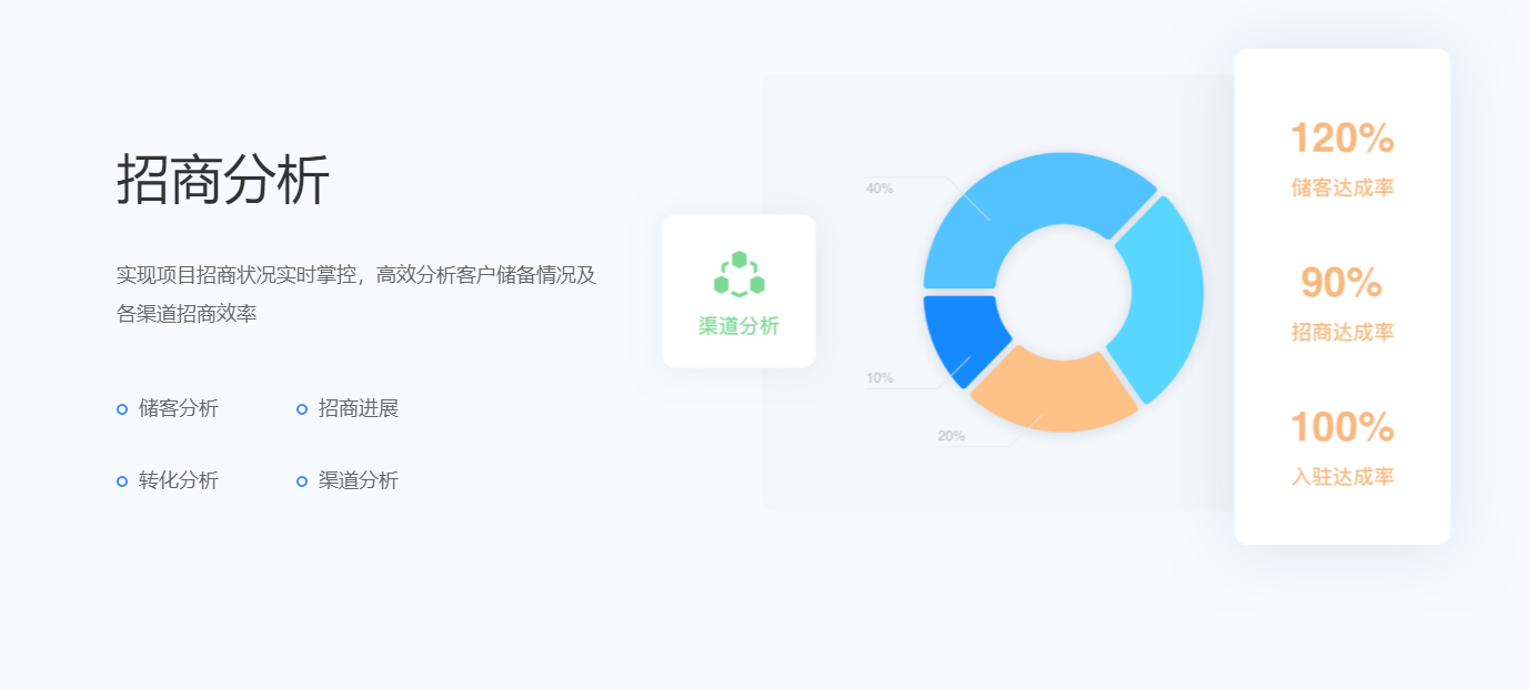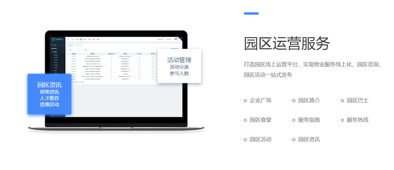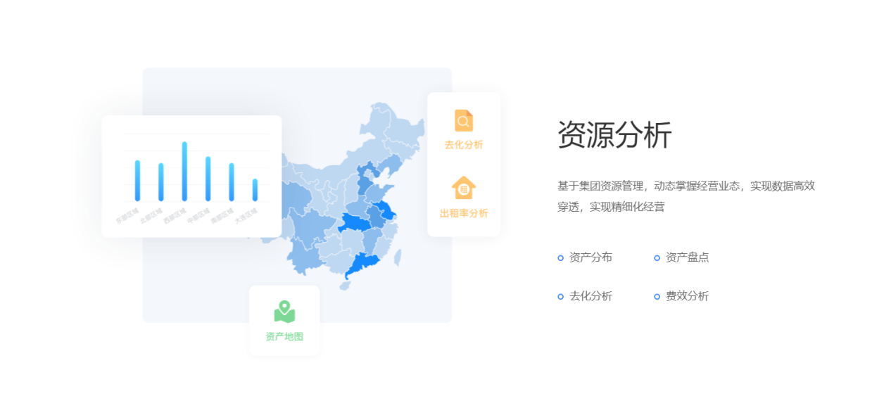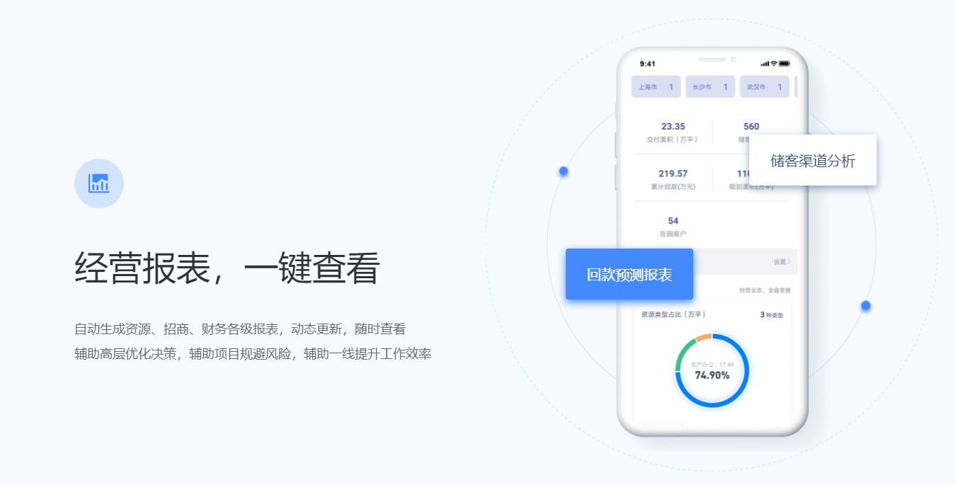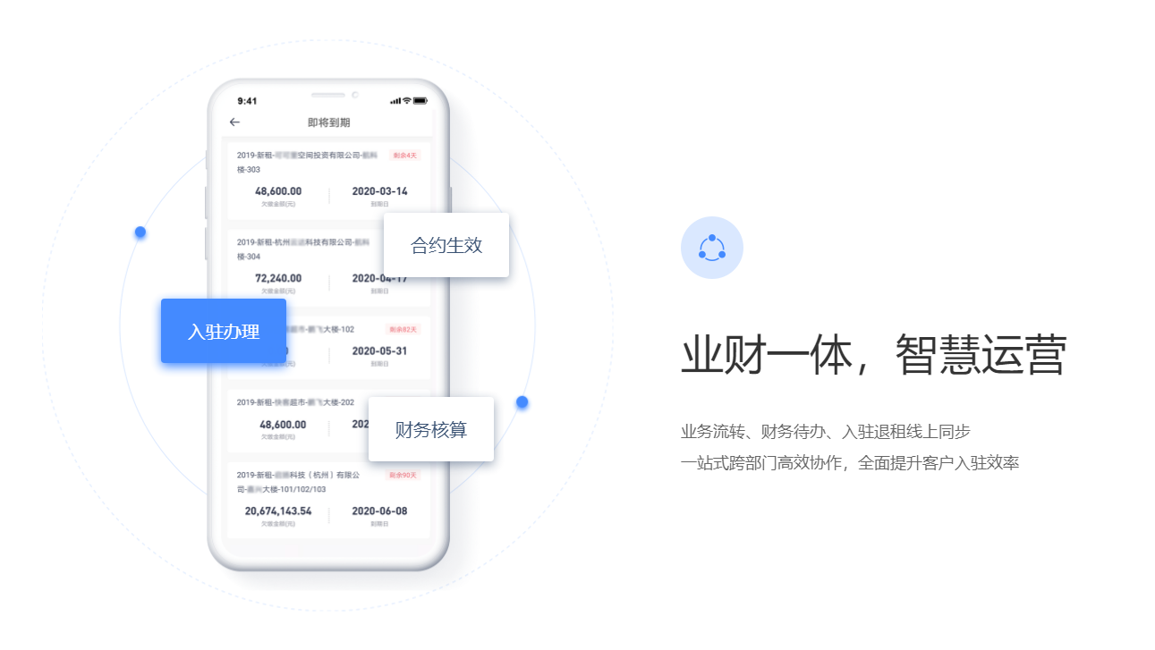 围绕产业客户招、租、管、退四个阶段,实现产业空间招商、租赁的核心业务管理闭环。基于大数据分析与物联网技术,帮助园区构建集楼宇资源管理、客户管理、合约管理、财务管理为一体的园区管控体系,有效解决园区运营痛点,提升园区运营管理效率与园区综合竞争力。