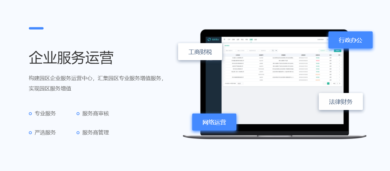 以企业诉求为核心,构建服务生态体系。围绕企业全生命周期所需的高频、刚需、核心服务,集合全国及本地优质服务资源,通过平台交互集成、集合议价,帮助园区打造统一线上入口+标准运营体系,实现产业运营服务生态共享、内生共赢。